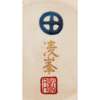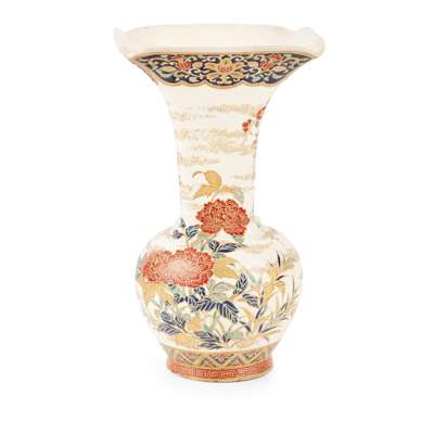 rising from a circular base, the spherical body leading to a tall neck and elaborately flared rim, painted in red, blue and gold enamel, the exterior decorated with a large cherry blossom tree and a branch of flowering peony on a crackled cream ground, the foot adorned with chevron panels containing foliage and a band of key-fret pattern, the mouth rim painted with foliage on a blue ground, the base signed ‘Ryōho’ in gold in between a blue Shimazu family crest and a 'Shōgetsu' seal in iron red