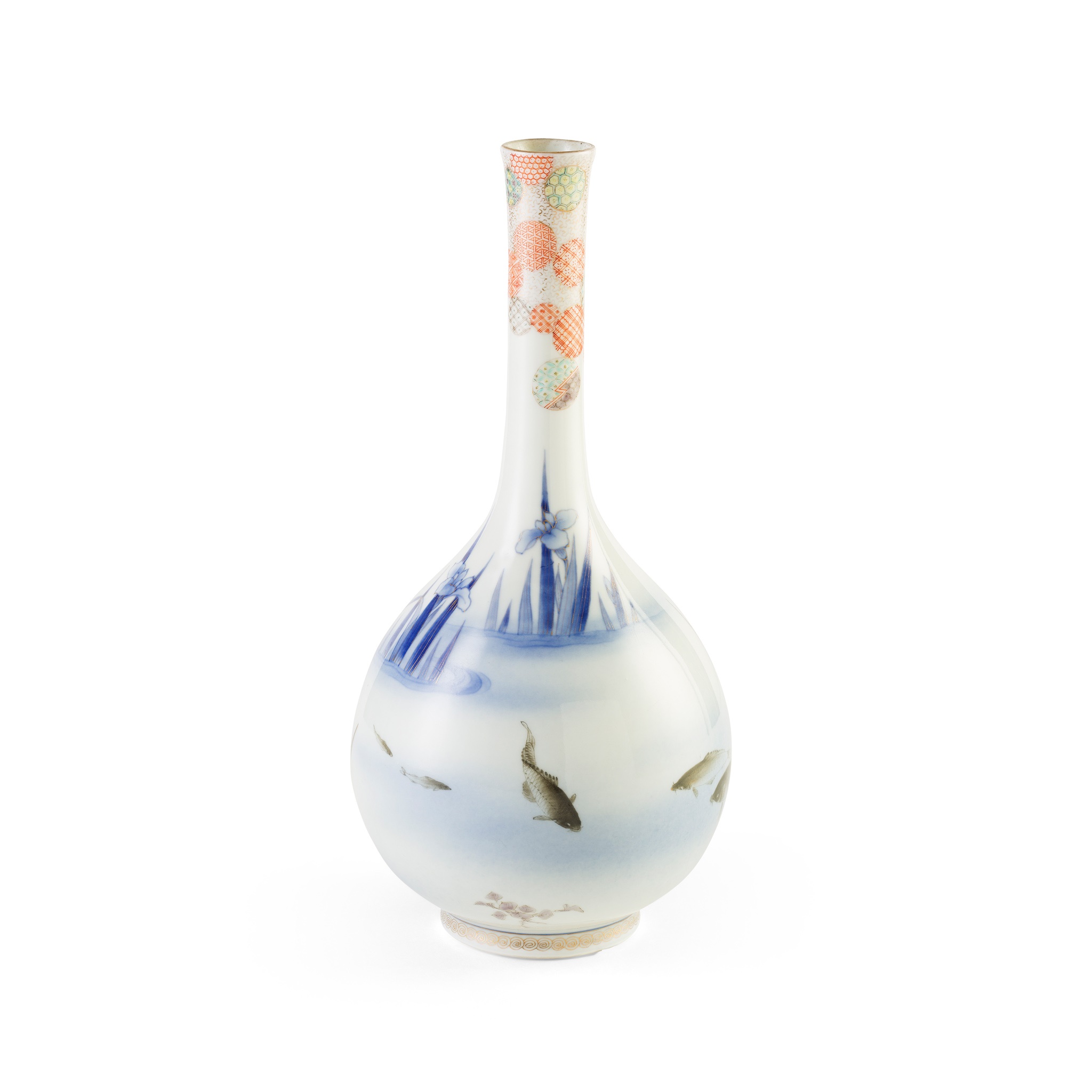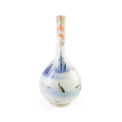 rising from a short foot, the globular body leading to a tall neck and subtly everted rim, the body painted with scenes of koi swimming amongst reeds highlighted in gilt, the neck decorated with overlapping circular patterns of various colours, the base signed 'Dai Nippon Arita Fukagawa Sei' mark under Mount Fuji and a stream in underglaze blue