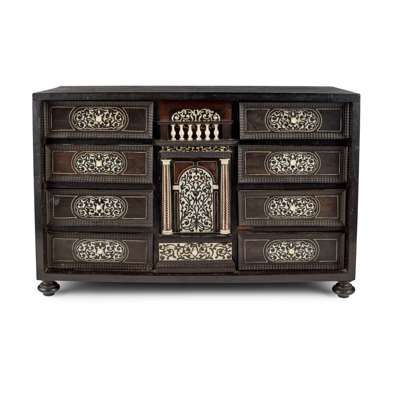 the rectangular top above eleven fitted drawers, the central section in the form of an architectural façade with columns and a balustrade above, each individual drawer with a central section of inlaid ivory in an interwoven vine motif and ivory handle