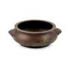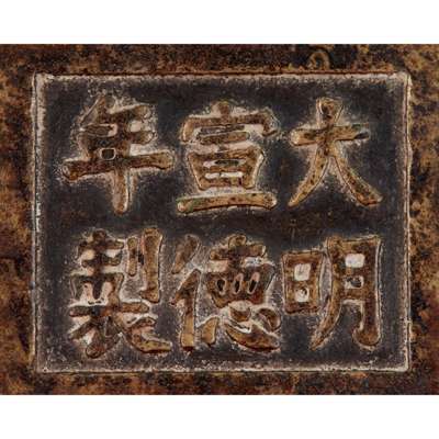 of compressed globular form, rising from a short foot to gently flared rim, flanked by mythical beast masks as handles to both sides, the base cast with a six-character apocryphal Xuande mark