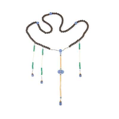 comprising one hundred and eight agarwood beads, spaced with translucent blue beads, the main tassel adorned with a pearl and carved blue glass double-gourd and tear-shaped pendants, the auxiliary tassels decorated with jade beads, pearls and tear-sharped pendants