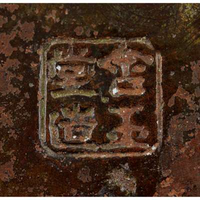 cast with a compressed globular body rising to a long neck, terminating to a garlic head and an inverted rim, the neck adorned with a coiled chi dragon in high relief, the base engraved with a four-character 'She Yu Tang Zao' workshop mark