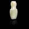of flattened form, the body carved in low relief with two entwined chi dragons on each sides, the neck decorated with plantain leaves between two chi-dragon handles in openwork, the stone of even pale celadon tone
