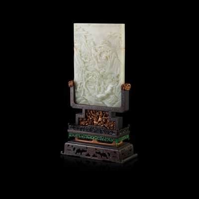 the white jade plaque of rectangular shape, carved on one side in various reliefs with a scholar accompanied by two young attendants walking in mountainous landscape settings, the reverse with two scholars in similar settings and a crane gliding in the sky, with an elaborately carved and silver-wire inlaid wooden stand raised on a podium