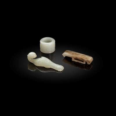 comprising: a Qing dynasty white jade belt hook in the form of a phoenix, with its head forming the hook and its curved body and well-defined folding wings as shaft, the reverse of the shaft with a round knob; a 20th century white jade thumb ring incised with shou longevity character against a diamond ground; and a Ming to Qing dynasty pale yellow jade sword slide, carved in relief with floral motifs