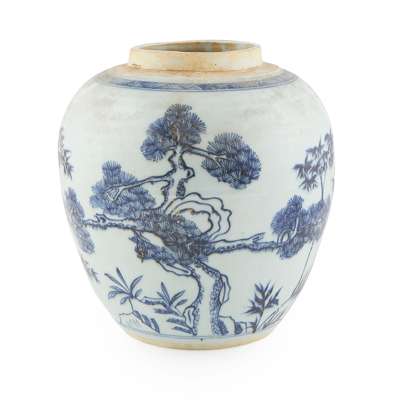 of tapered globular form, painted around the body with prunus, bamboo and pine tree, the base with a double circle