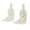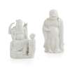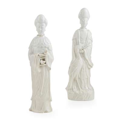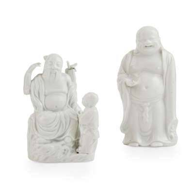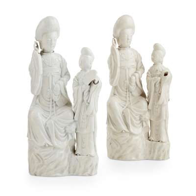 comprising: a near pair of figural groups depicting court ladies with mirror, each moulded with an attendant holding up a mirror for Her Ladyship to fix her flamboyant hair; a pair of seated Guanyin, each crackle-glazed Bodhisattva seated in royal ease pose with her right hand holding a scroll; a standing figure of Budai; a figural group of an ear-picking deity with his attendant crossing the arms over his chest; a standing lady with a tamed phoenix clinging closely to her right; and a standing lady holding a bird carrier