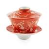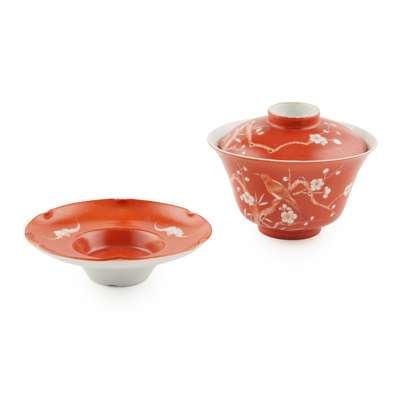 RED-GROUND RESERVE-DECORATED 'PRUNUS' LIDDED CUP AND SAUCER