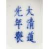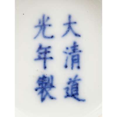 each thinly potted, finely painted to the exterior of the bowl and lid with magpies perching on prunus, three bats on the saucer, the base of the bowl with a six-character Daoguang mark in underglaze blue