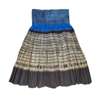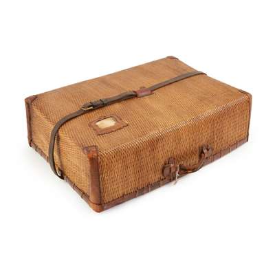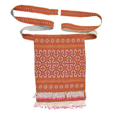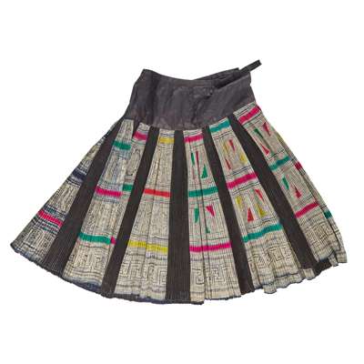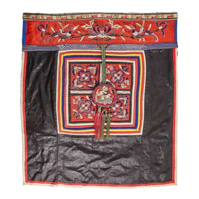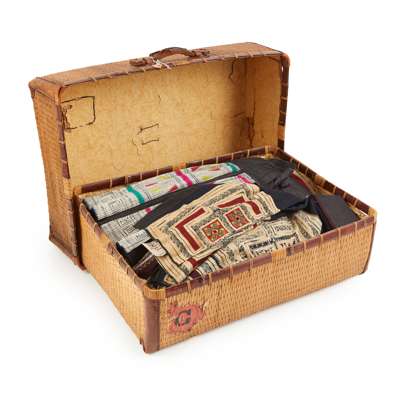 comprising: a batik cross-stitch embroidered blouse (130cm across sleeves, 80cm long) and pleated long skirt (84cm long) from Liuzhi, Guizhou; a pleated short skirt (54cm long); a cross-stitch embroidered red dip hem jacket (122cm across sleeves, 92cm long); a red silk ground embroidered black linen jacket (125cm across sleeves, 84cm long); two embroidered baby carriers from Guizhou (largest: 84cm x 69cm); a cross-stitch embroidered orange and red apron with white painted seed beads dangles (53cm x 36cm); two pairs of white metal earrings, with a Japanese wicker suitcase
