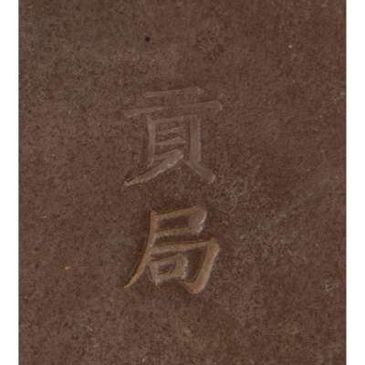 the compressed globular vessel mounted with brass at the knob and rims, the base incised with a two-character 'Gong Ju (tribute office or bureau)'
