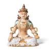 the figure seated in padmasana with hands rested on knees, dressed with low dhoti draped over legs, adorned with bejewelled necklaces to his bare chest with shoulders covered with cloud-decorated shawl, the face with a benevolent expression, crowned with a five-leaf tiara in front of a high chignon