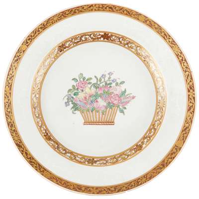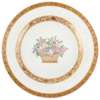 each painted to the interior with a basket arranged with variety of flowers and fruits, a white-enamelled flower band decorated the cavetto between two bands of gilt-decorated flower band