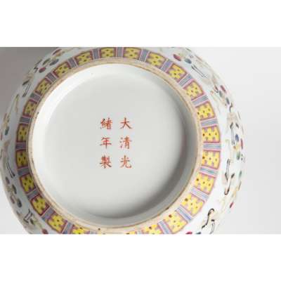 of compressed globular form with long cylindrical neck, the body painted with cranes and four-ruyi-headed auspicious clouds flying in every direction, the base inscribed with a six-character Guangxu mark in iron-red