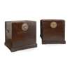 each of square and plain form, with hinged cover, mounted with circular engraved clasps, sides with carrying handles, on a low wooden stand