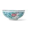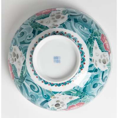 the exterior painted with sprays of flowers in rounds against an abstract blue ground, the base inscribed with a six-character 'Zhong Guo Jing De ZHen Zhi' (Made in Jingdezhen, China) in underglaze blue