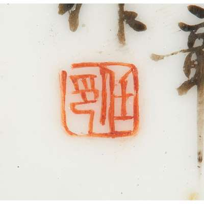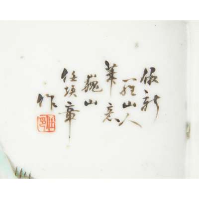 with indented corners and gilded rim, the interior enamelled with shanshui landscape and inscription to the top right