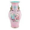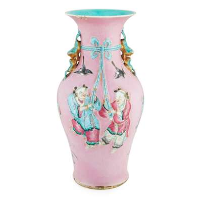 the pink ground body painted with foliage and phoenixes to one side, the other with two figures and ribbon, twin stylized animal handles to the neck