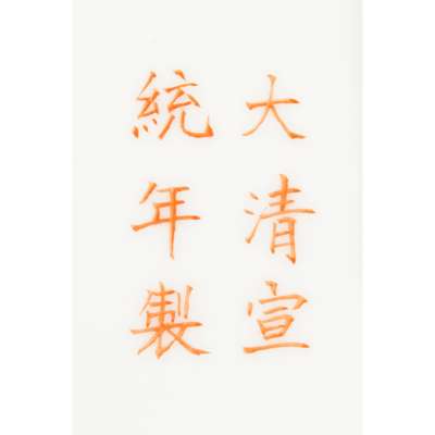 on short foot, shallowly raised to a waisted body and foliated rim, painted to the central medallion with a stylised lotus encircled by symmetrical abstract ring, further by dense scrolling lotuses, with four bats on the mouth, the base inscribed with a six-character Xuantong mark in iron-red