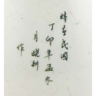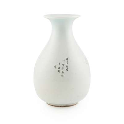 of yuhuchun shape, the bulbous body painted with idyll shanshui landscape to one side, the reserve inscribed and signed by Zhang Xiaogeng (1885-1944) in the year of Dingmao year (1927), the base with 'Hu Nan Ci Ye Gong Si' (Hunan Porcelain Company)