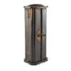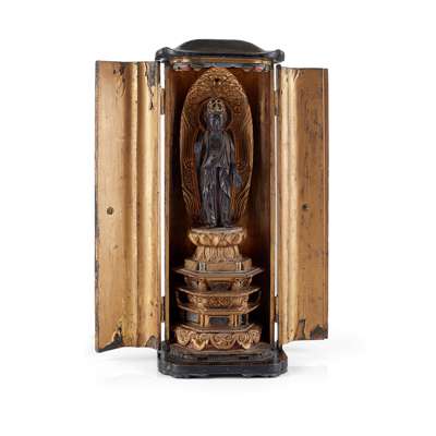 the black lacquered case with indented corners and pair of hinged doors opening to the gilt-finished interior revealing a standing figure of Kanon supported on a lotus flower rising from an elaborate waisted plinth