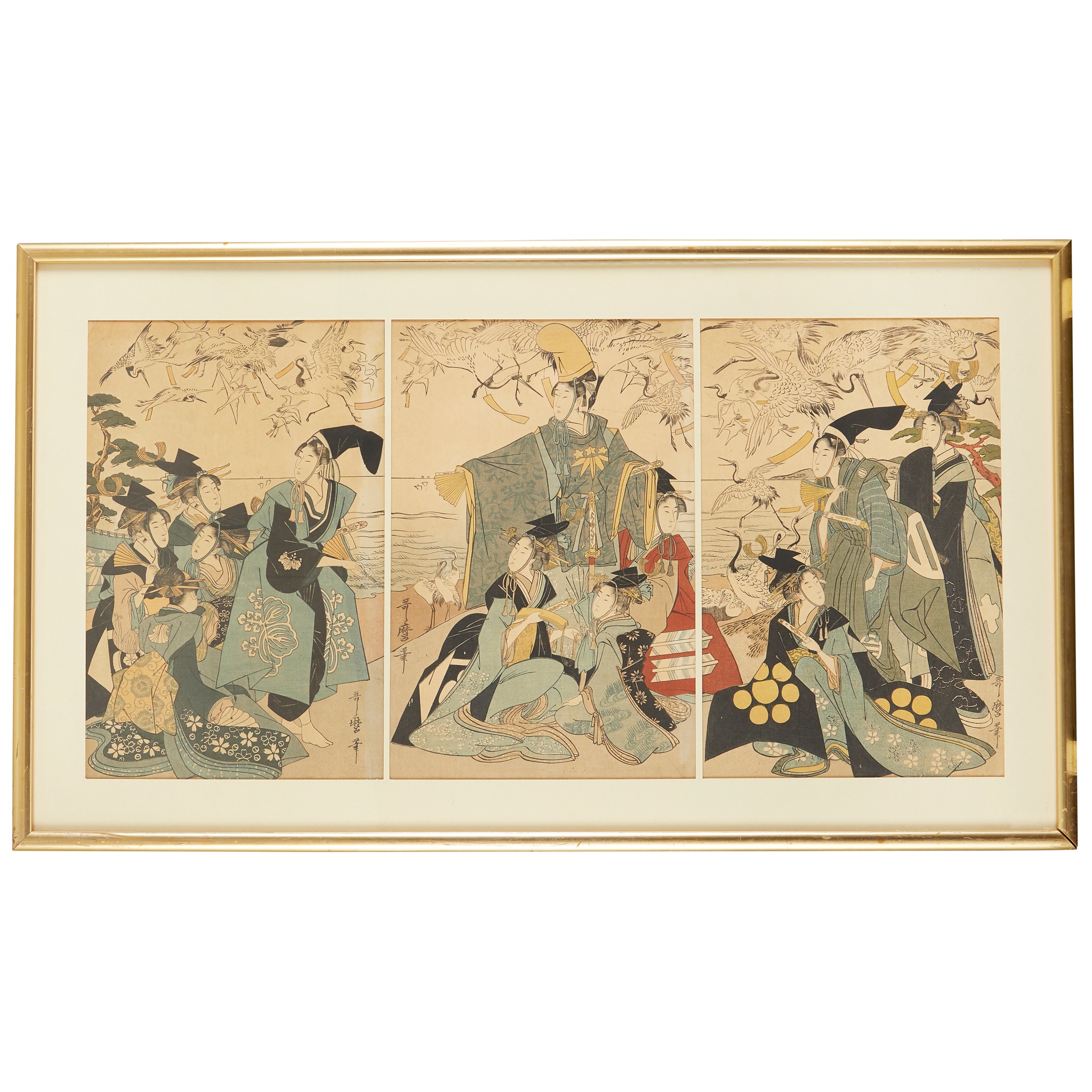 comprising three oban tate-e; depicting courtesans as courtiers on the seashore below flying cranes tied with poem cards, each signed Utamaro hitsu, framed
