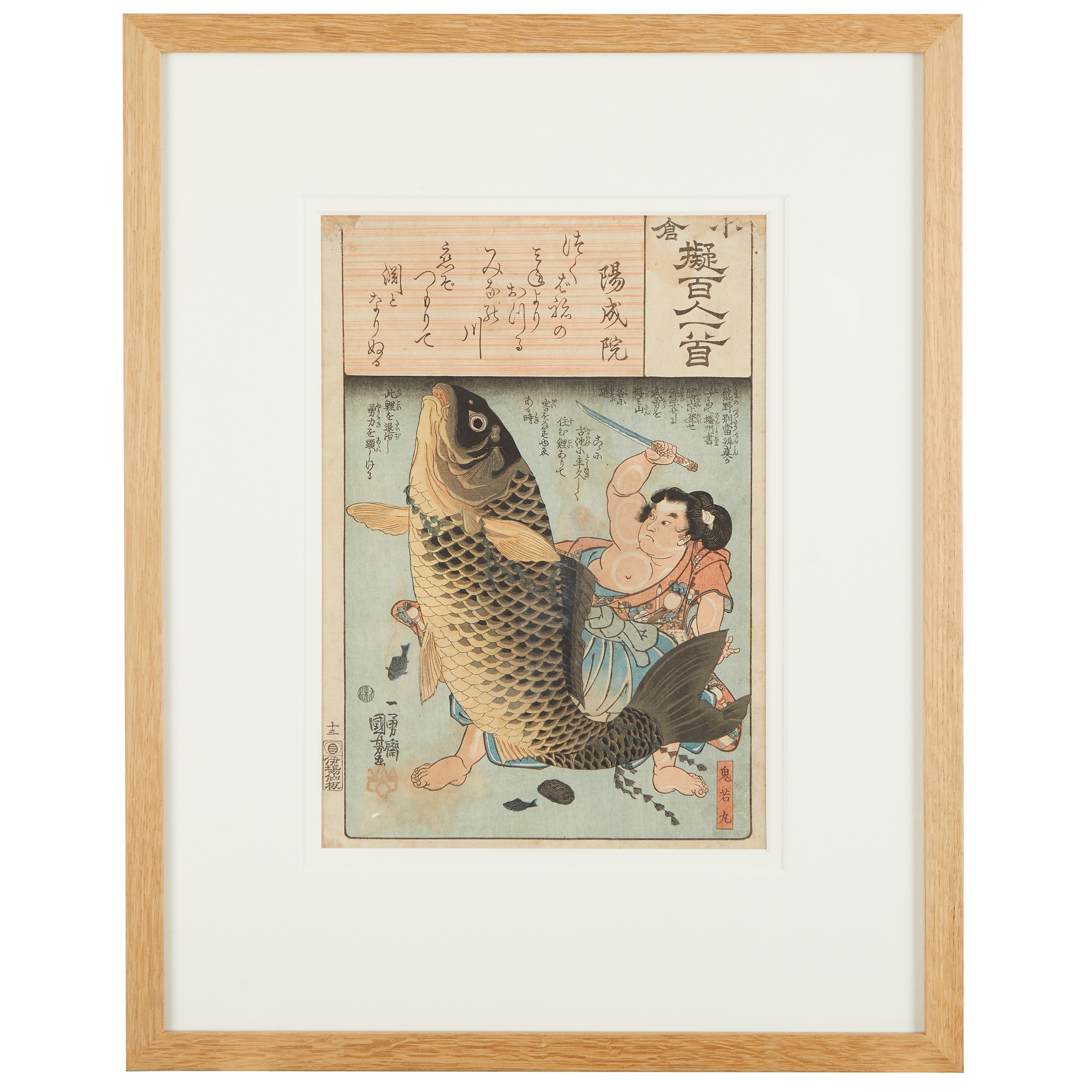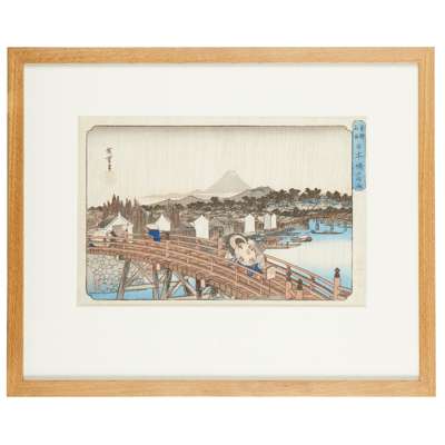 comprising: 'White Rain on Nihon Bridge' by Utagawa Hiroshige (1797-1858), from 'Famous Places of the Eastern Capital', published by Kikakudo (Nihpmrashi No Hakou, 1832, 24.5cm x 37.5cm); and 'Oniwakamaru' by Utagawa Kuniyoshi (1798-1861), from 'Collection of 100 Poems' (34.5cm x 24.2cm), both framed