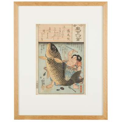 歌川広重 《東都名所日本橋之白雨》及 歌川 國芳《小倉擬百人一首陽成院(鬼若丸)》版畫兩幅