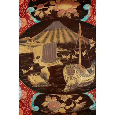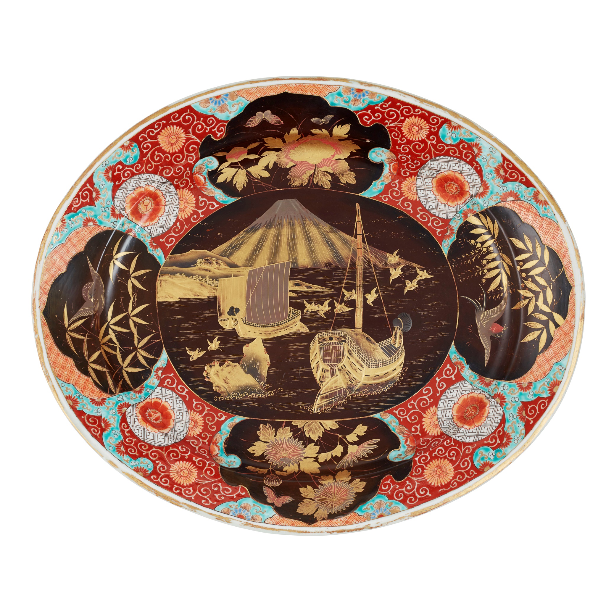 sitting on a ring base, the borders with foliate designs vibrantly painted in a characteristic palette, with unusual use of black enamel and gilt painting, the four exterior panels feature scenes of birds and butterflies amongst reeds and flowers, the interior with three ships at sea, Mount Fuji behind, the underside with further foliate motifs