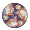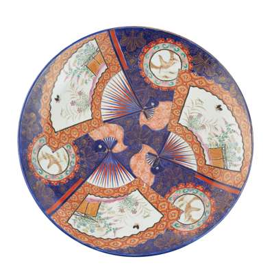 decorated in a vibrant palette, three fans painted with butterflies in a garden, three panels showing birds in flight, all separated by a blue ground with gilt detailing of leaves and flowers