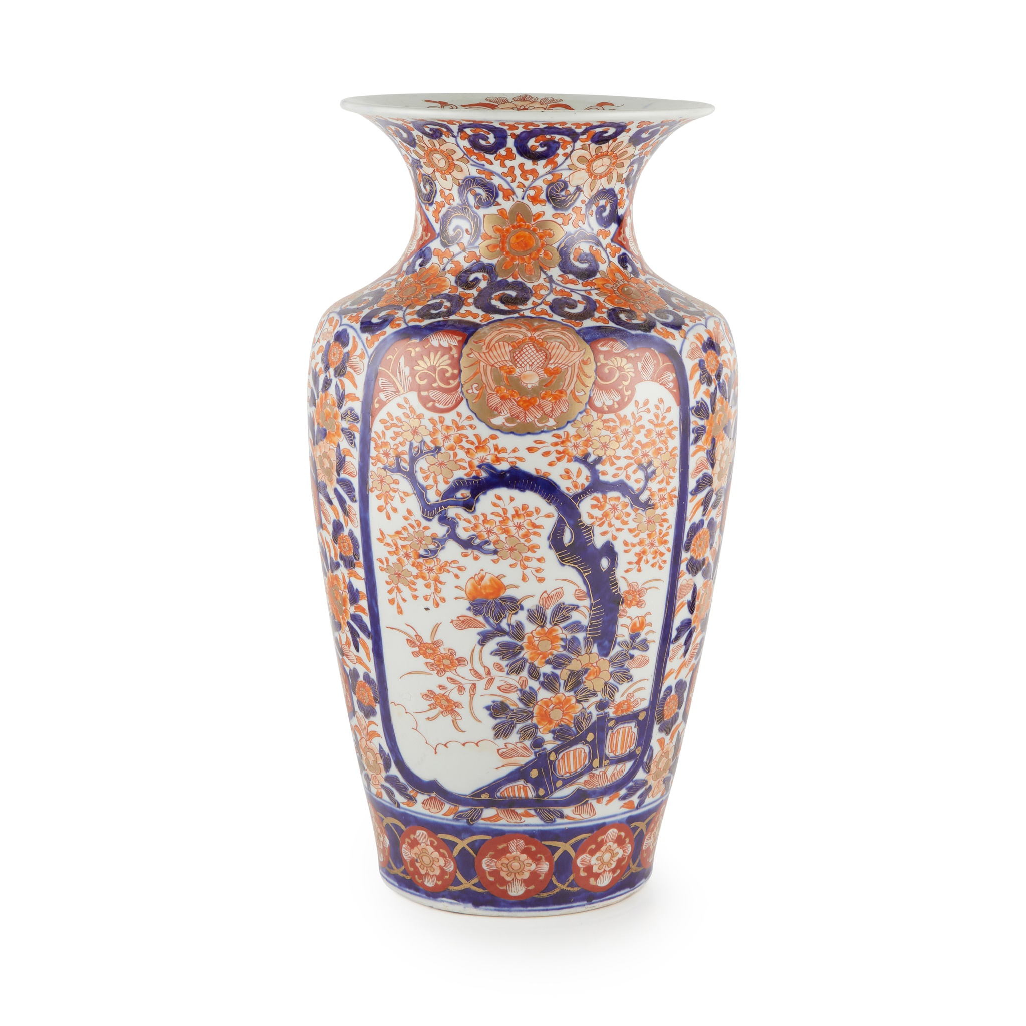 painted in two rectangular cartouches with cherry blossom tree reserved on a flowery ground in cobalt blue, iron-red and gilt, with a carved wooden stand