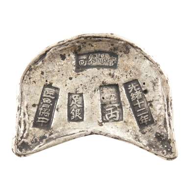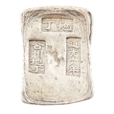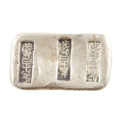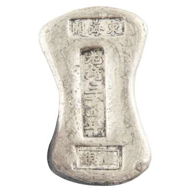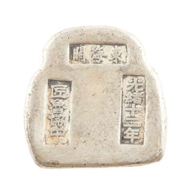 comprising: two white metal ingot bearing characters 'Jiang Lu Xie Zhong, Guangxu 12th year'; a waisted rectangular shaped ingot with 'Dong Hai Guan, Treasury, Guanxu 24th year'; a rectangular ingot with 'Di Ding, He Zhou Di Ding, Daoguang 6th year'; a rectangular ingot with repeated 'Guangxu 30th year'; and ONE EXPORT MINIATURE SILVER WATERING CAN, hallmarked 'Qing' in Chinese and 'CS'