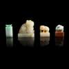 comprising: a jadeite square seal with a bat finial, the stone of mixture pale and brigh green tone; a rectangular seal with a seated qilin finial, the stone of pale celadon tone; a square seal with a standing mythical creature finial of yellowish tone; a square seal with a goose finial of celadon tone with brownish skin