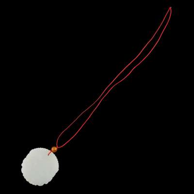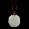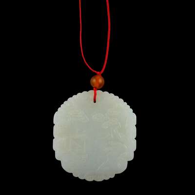 carved to one side with a pair of bats flying in a bamboo groove, the reverse with pavilions amongst pine trees, the stone of even pale celadon colour