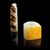 comprising: a pale celadon-coloured thumb ring cleverly features the brownish orange skin to one side; a celadon jade hat pendant similarly saves the russet skin on the flattened side