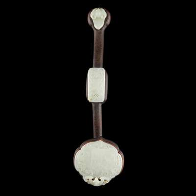 the brown wood sceptre with silver-inlaid floral pattern, inset with three shaped jade plaques, the top and largest jade plaque carved in relief with a caparisoned elephant below a bat, the middle with orchid between auspicious emblems, the last carved in high relief with a stylised bat and a peach