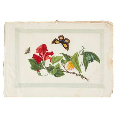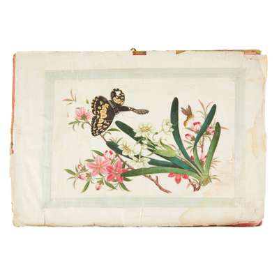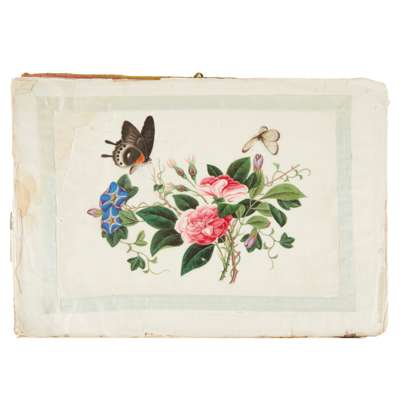gouache on pith paper, comprising 10 paintings depicting various species of butterflies fluttering around exotic flowers, the verso of the covering sheet in the album pasted with the red-stamped label reading Sunqua Painter * China Street No. 4 in Roman italics.