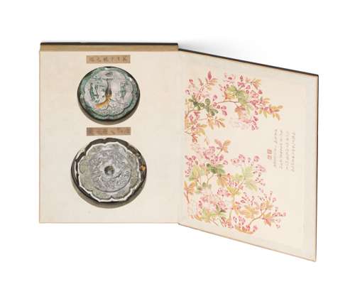 the first octalobed, the reverse decorated in high relief with the mythological moon hare under an osmanthus tree, the second in the shape of a lotus flower, the reverse decorated with four immortals, with fitted box inscribed with a poem by Dong Gao (2)