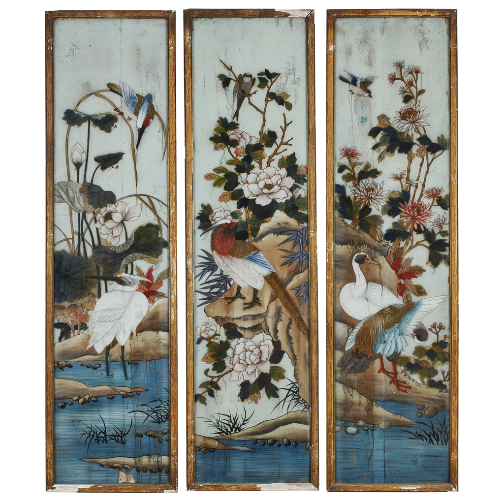 SET OF THREE REVERSE GLASS PAINTED PANELS