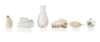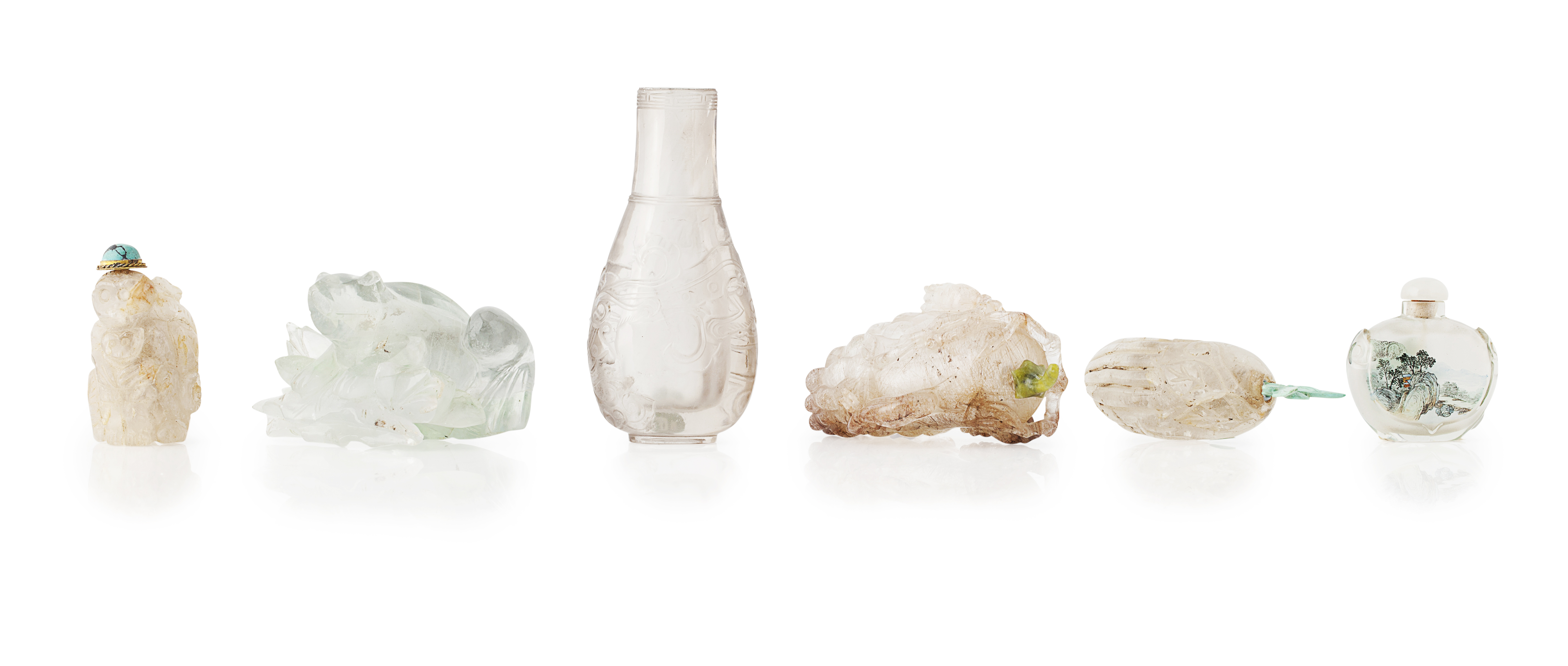 comprising; four rock crystal bottles, two of finger citrus form with rutiles, one in the shape of a monkey, one of elongated ovoid form with carved dragon decoration; a quartz bottle in the shape of a frog resting on a lotus leaf amongst two lotus flowers; and an inside painted glass snuff bottle (6)