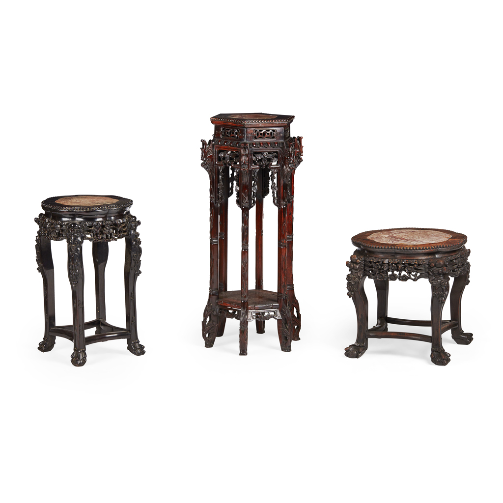 two of hexalobed form with an openwork apron carved overall with flowers and foliage, the cabriole legs terminating in paw form feet, the third of hexagonal form, the legs shaped as bamboo stems adorned with dragon heads (3)