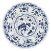 with barbed rim and moulded sides to resemble petals, painted to the centre with grapes amongst scrolling vine leaves within a floral-shaped panel of double lines, all within a double ring, with floral sprays around the sides and a band of floral scrolls along the rim, the reverse with ruyi-shaped flowerheads and an unglazed foot