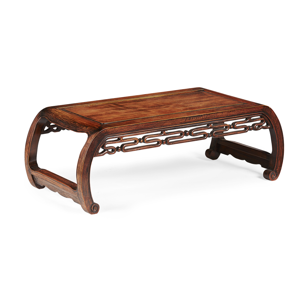 with pierced apron on legs strengthened by two cross stretchers, terminating in scrolled feet