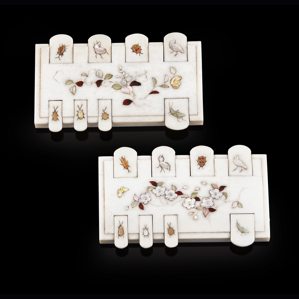 each typically inlaid with mother of pearl, horn and coloured hardstones with a spray of flower in the centre, flanked by insects and birds (2)