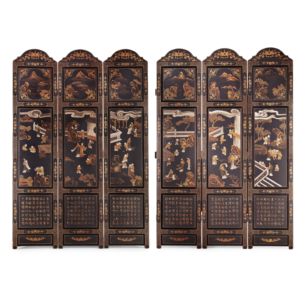each fold decorated in silver and gilt with boys and courtiers engaged in various pursuits, the lower panels with calligraphic script