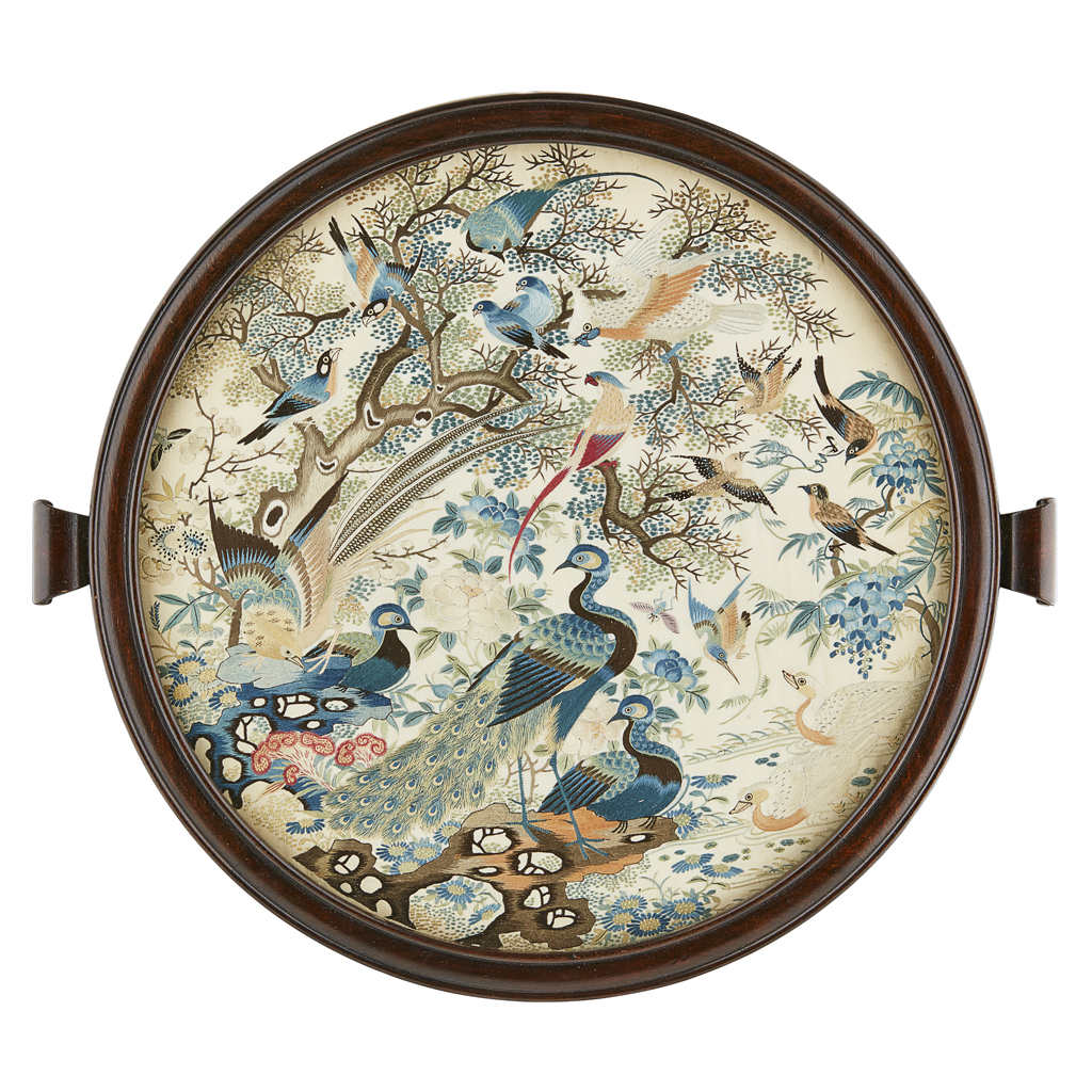 embroidered on a beige ground with birds amongst trees and flowers including peacocks perched upon rocks beside peonies and below pine trees, framed and glazed
