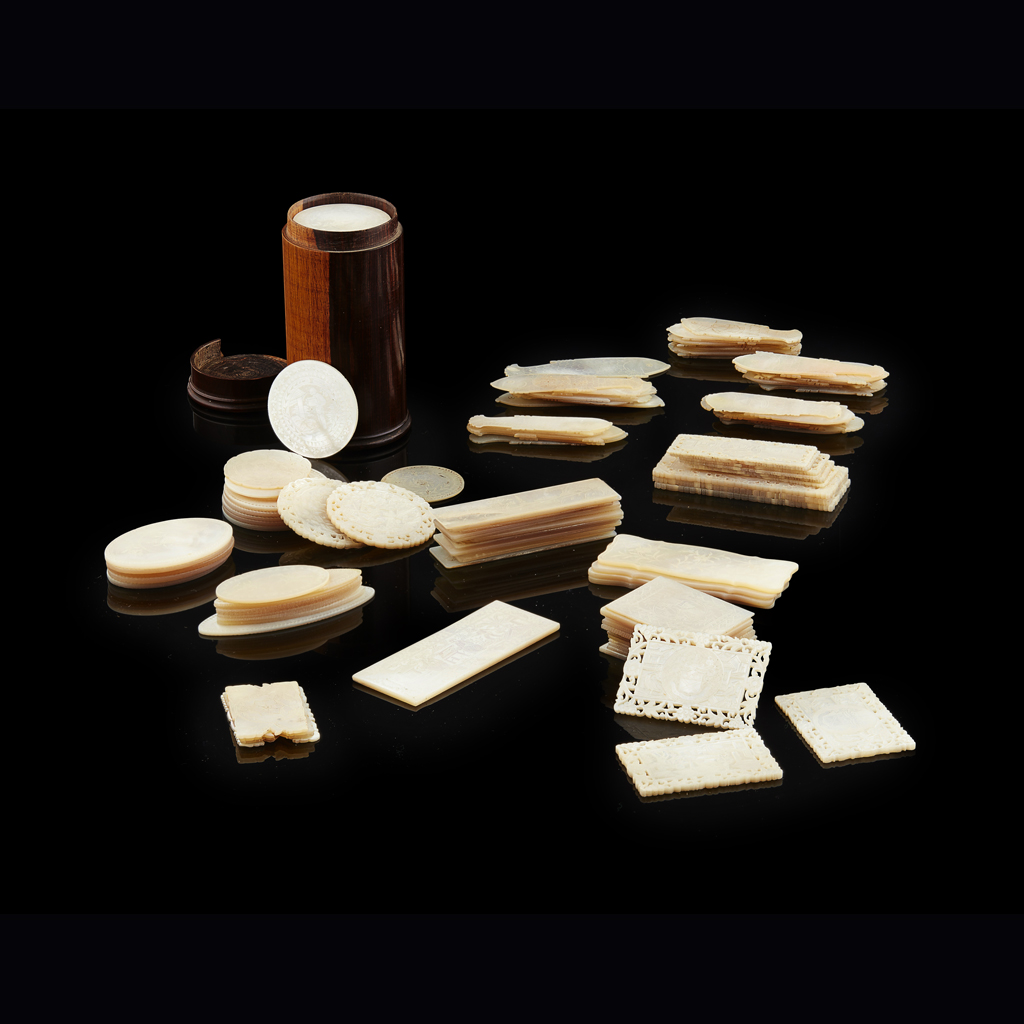 comprising 156 assorted counters carved in various shapes, eight of which engraved with the Melville family's coat of arms with the latin motto 'denique coelum' (heaven at last), on a low relief landscape ground and within a reticulated border, some further counters carved with Chinese scholars and laymen men engaged in various pursuits