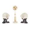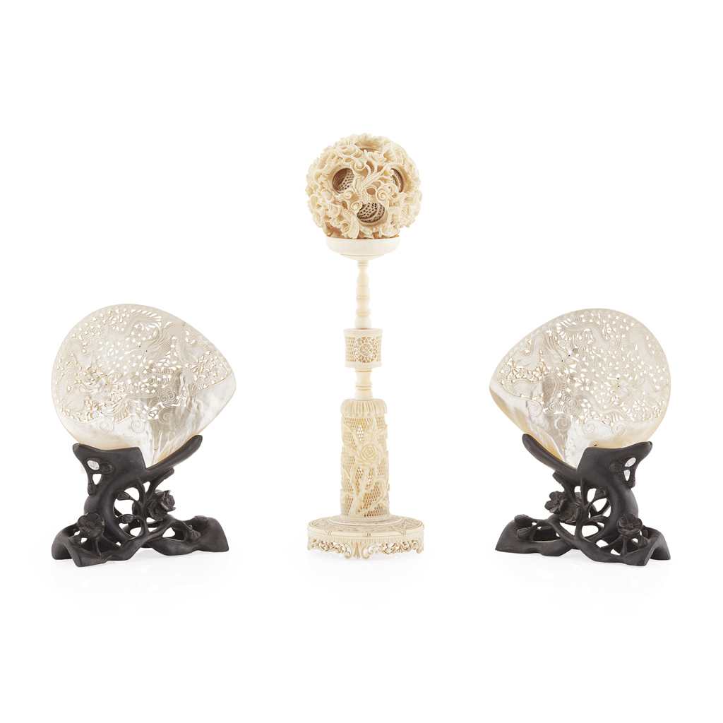 each intricately carved and pierced with a pair of dragons chasing a flaming ball amid dense clouds, on pierced wood stands with prunus decorations, 15cm wide; together with a CANTON IVORY CARVED PUZZLE BALL AND STAND, the ball carved to the exterior with conjoined dragons, the stand carved with peony flowers and the cylindrical base with birds and flowers, 31cm high (3)