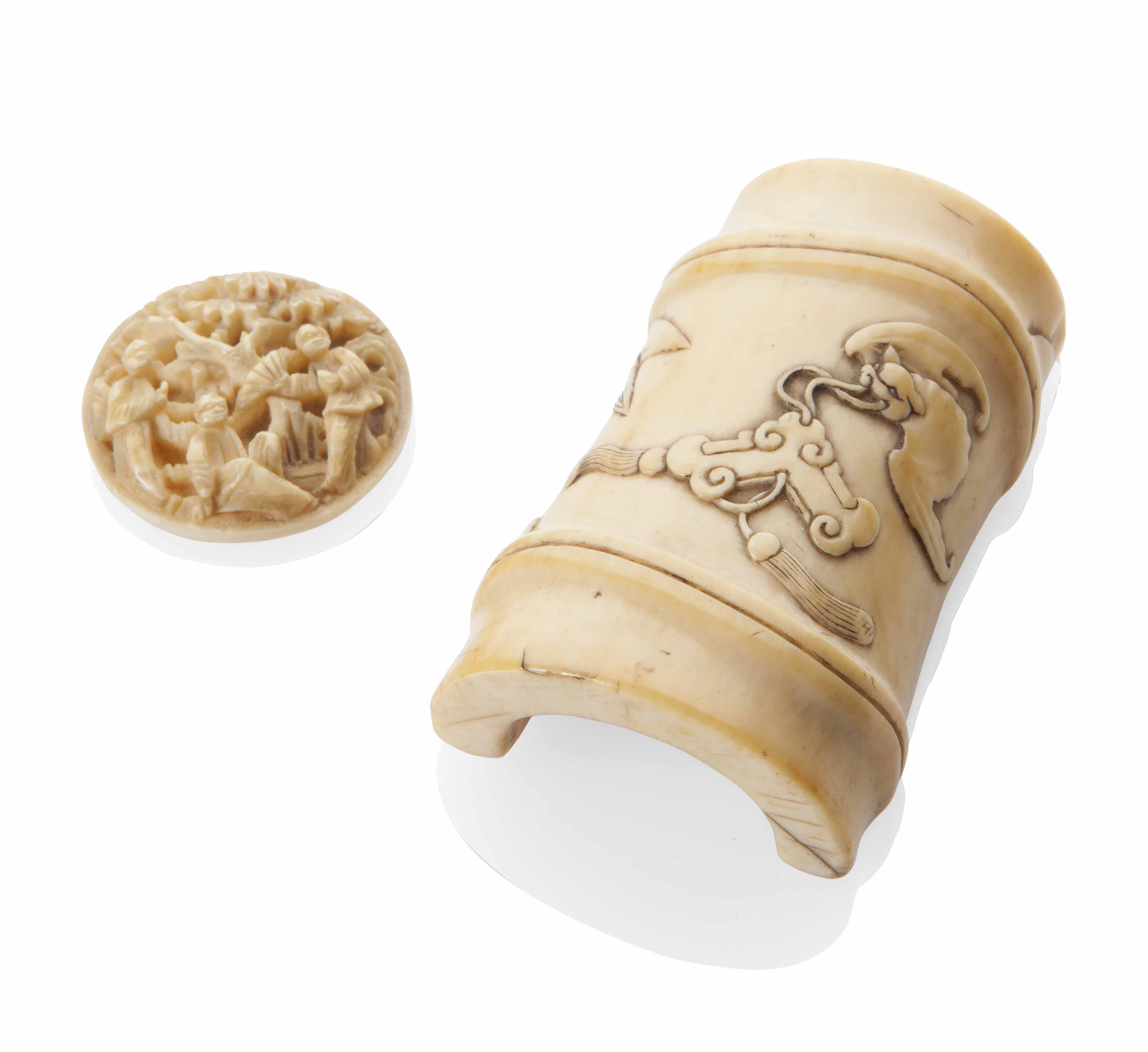 a round miniature plaque deeply carved with a scholar resting under a tree with two attendants; a miniature bamboo-shaped wrist-rest carved with a bat on the convex front and a cicada on the convex reverse (2)