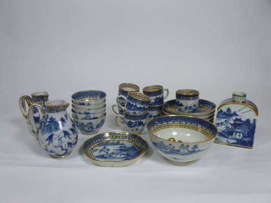 consisting of two jugs and covers, a tea caddy and cover, five tea bowls and saucers, seven cups with loop handles, a slop bowl and a foliate stand, decorated in underglaze blue with typical riverscape scene, the gilt decoration most likely later and European (22)